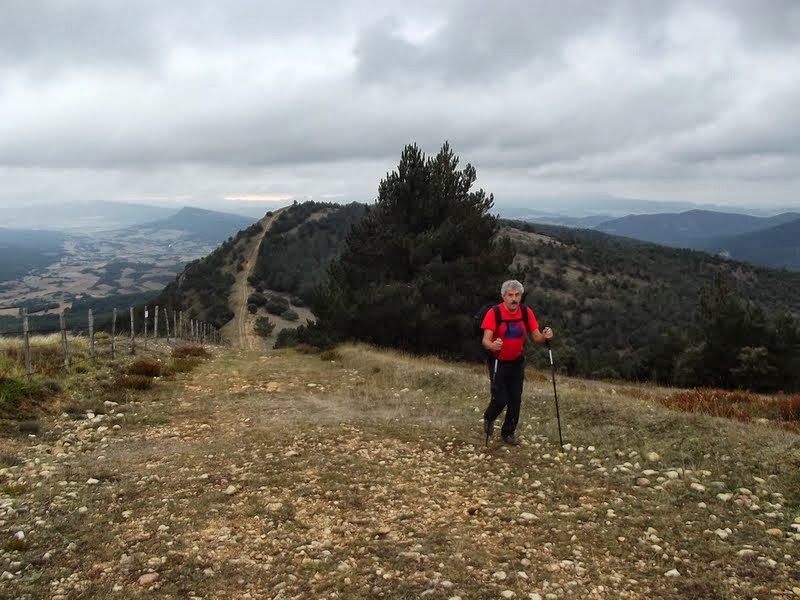 En la misma cima abandonamos la otra ruta descendiendo directamente por un cortafuegos que baja hacia el Sur, la pendiente al principio es mantenida pero sobrepasado un montón de piedras el cortafuegos desciende bruscamente alcanzando altos grados de desnivel.